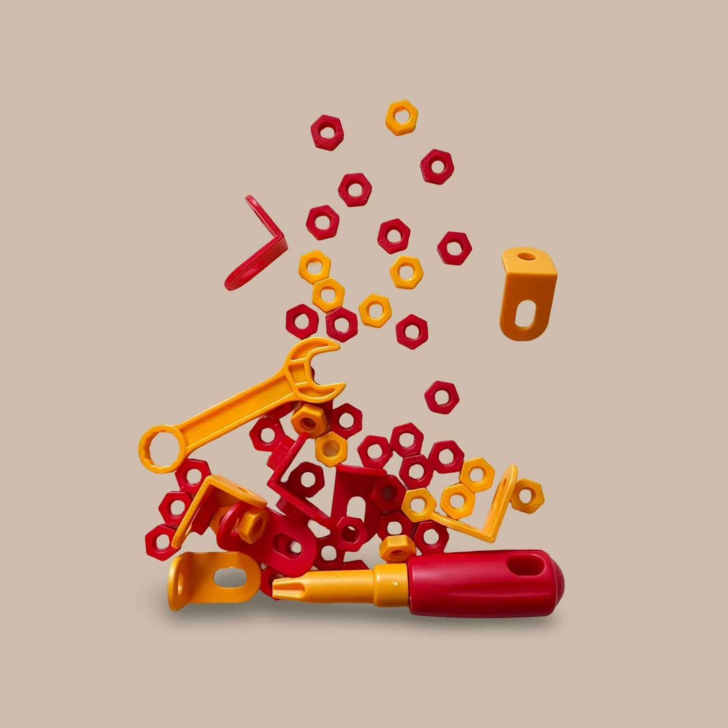 Sættet indeholder 40 møtrikker, 8 vinkelbeslag, 1 fastnøgle og 1 skruetrækker – alt sammen perfekt dimensioneret til små hænder. Delene gør det let for børn at samle, spænde, dreje og eksperimentere med mere avancerede konstruktioner, mens de øver finmotorik og problemløsning.