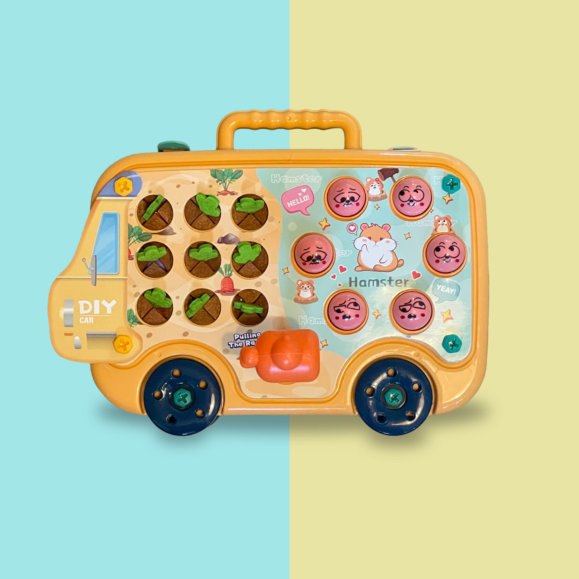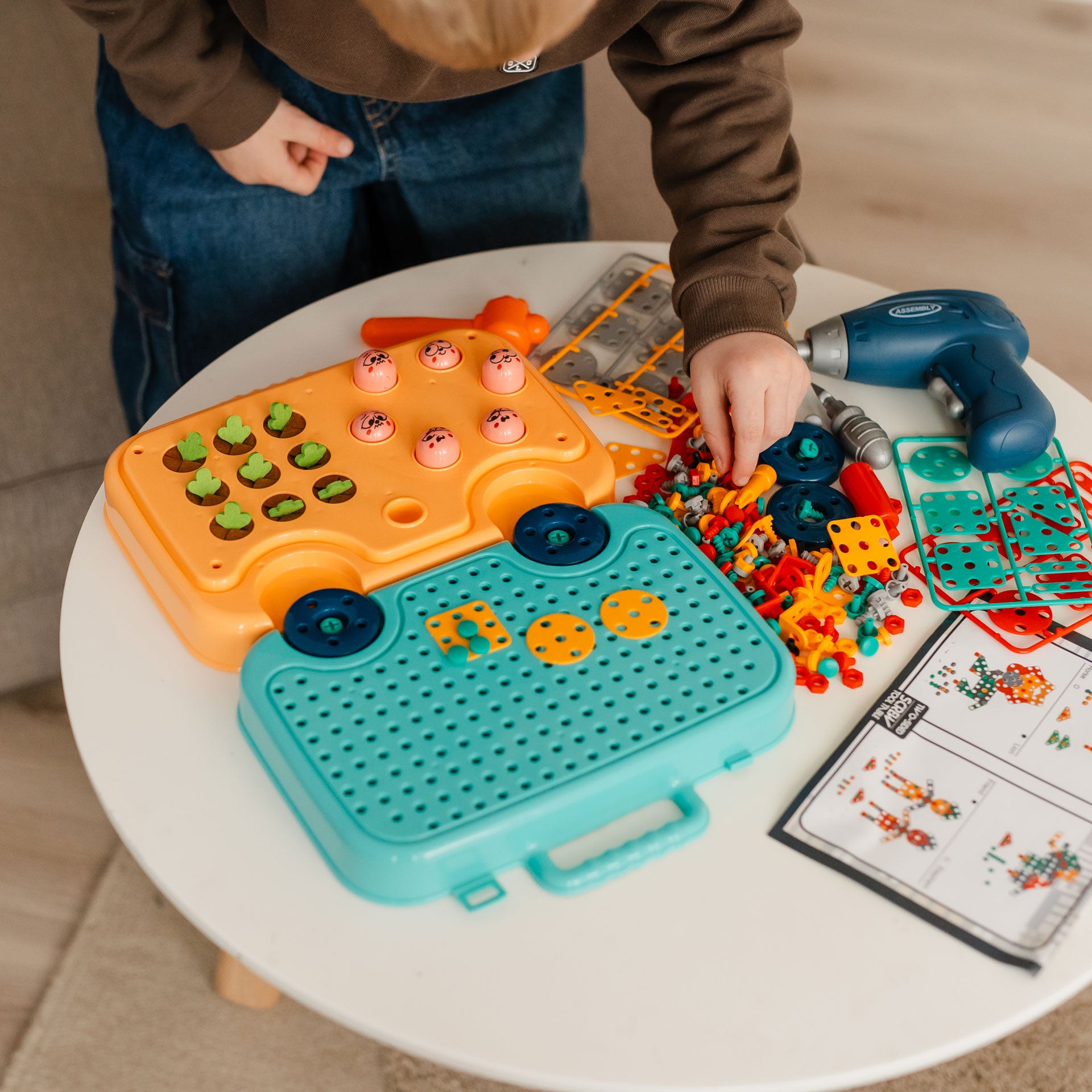 Skruekassen er et kreativt byggesæt til børn med elektrisk “skruemaskine”, skruer og plader – skabt til leg, læring og masser af konstruktion. I denne version for du udover de normale funktioner i Skruekassen også en side hvor man kan udfordre finmotorikken yderligere med at "hive grøntsager op af jorden" eller spille det klassiske "Whack-a-mole".