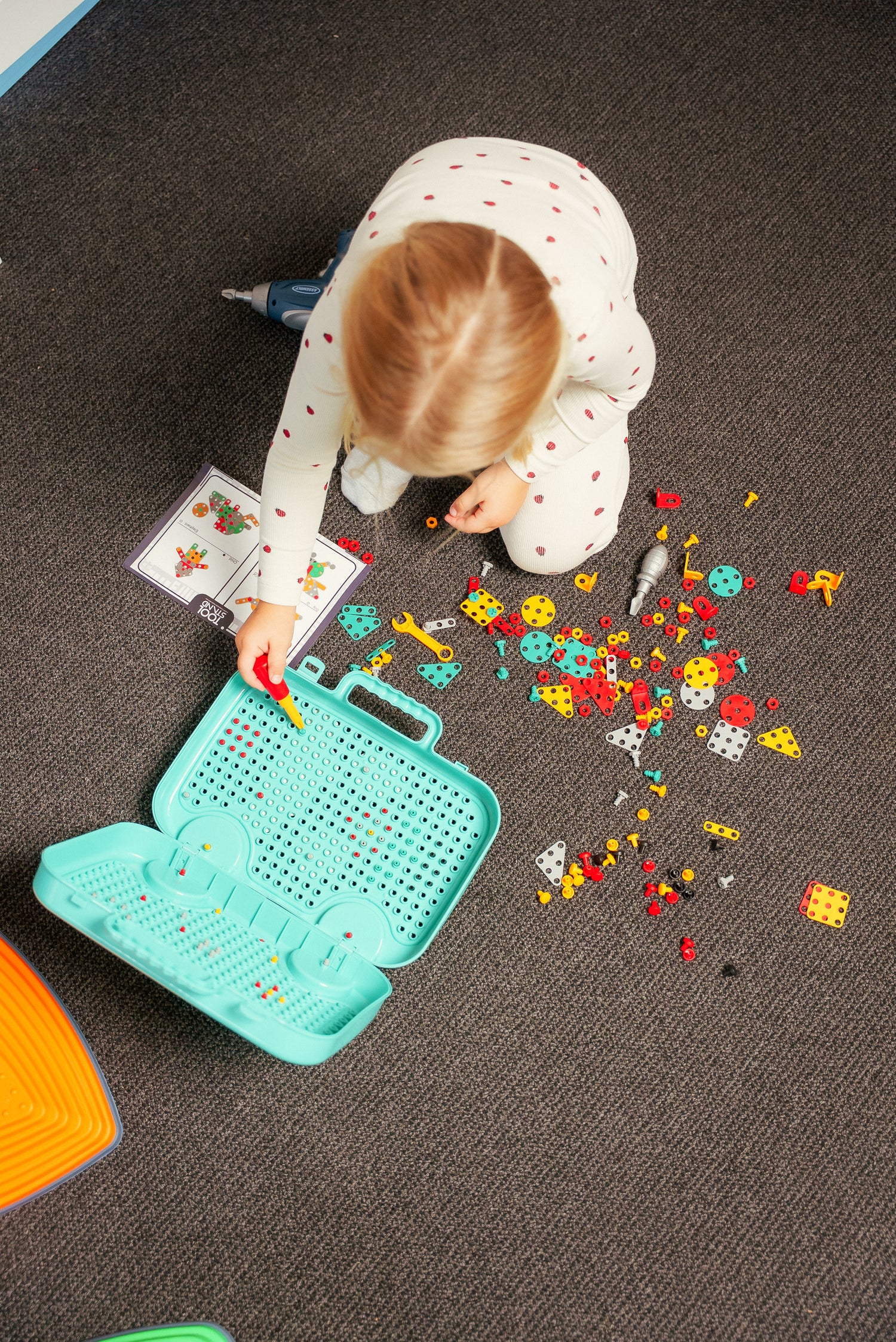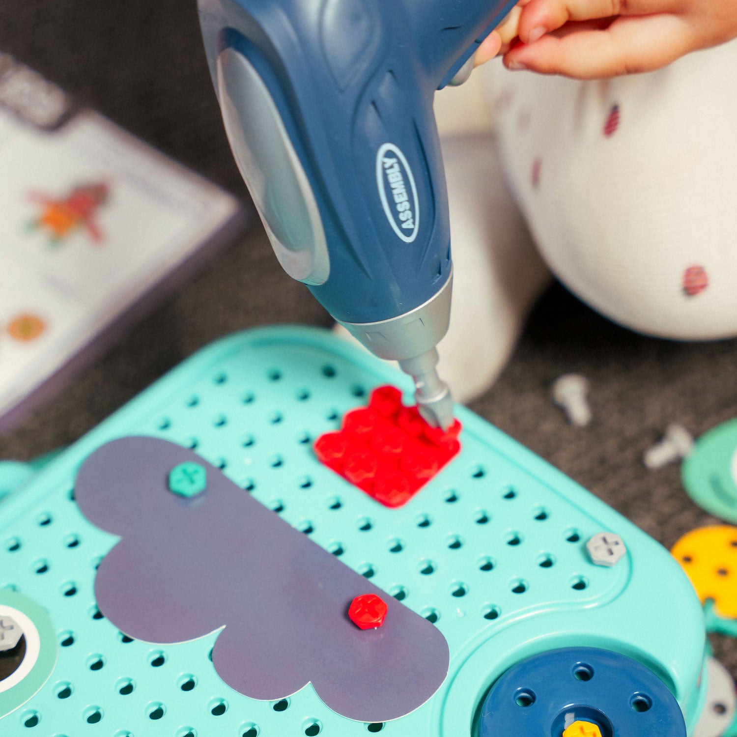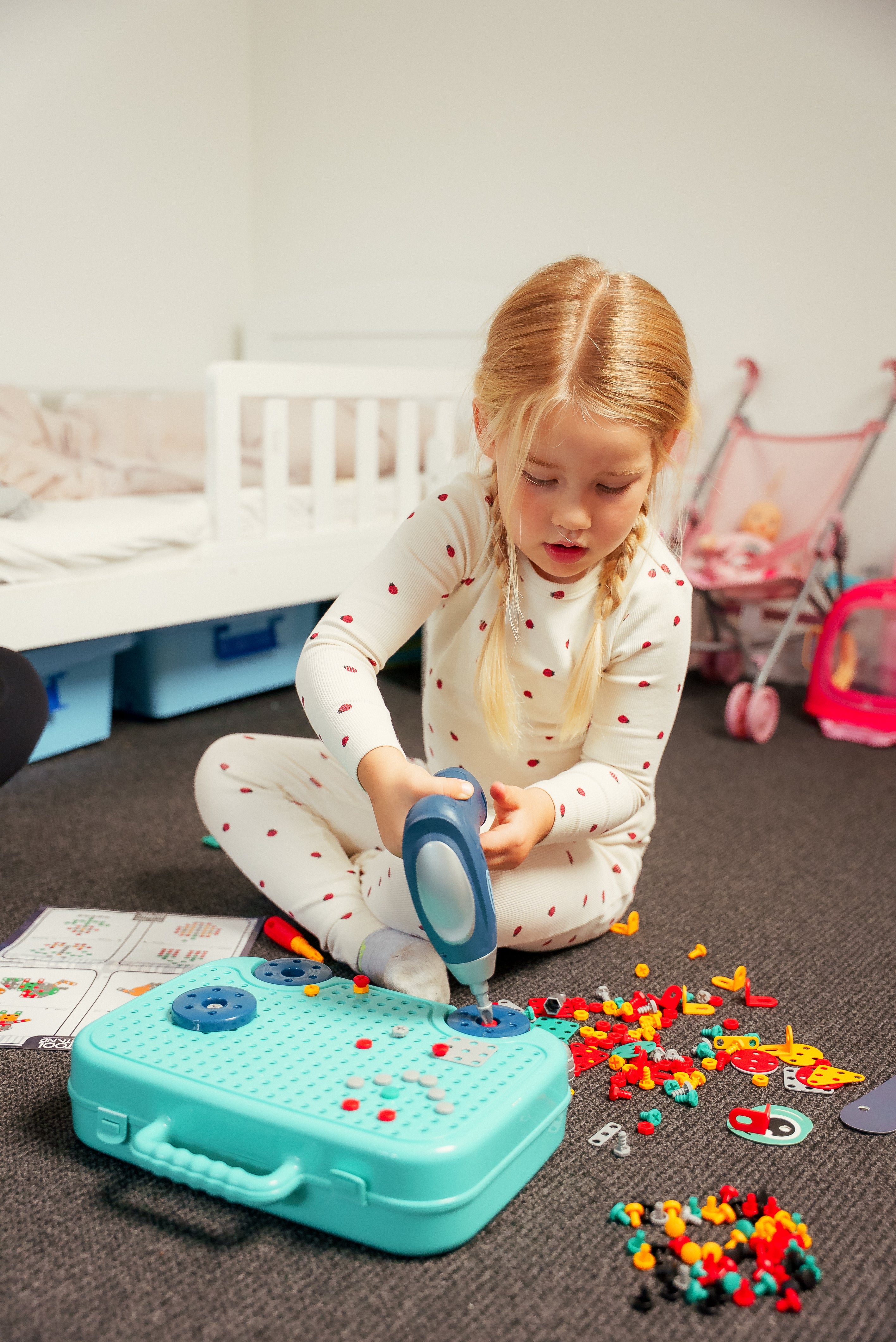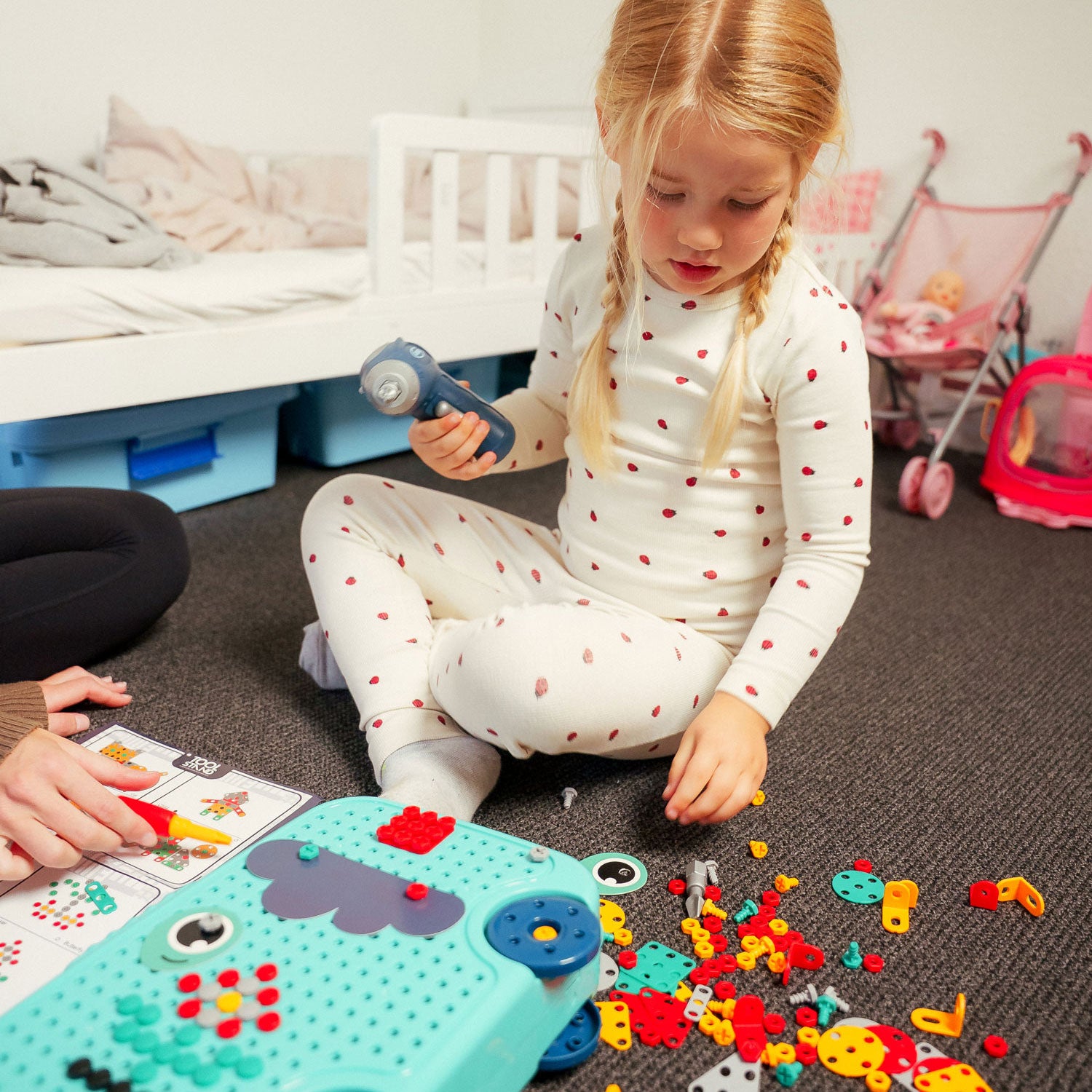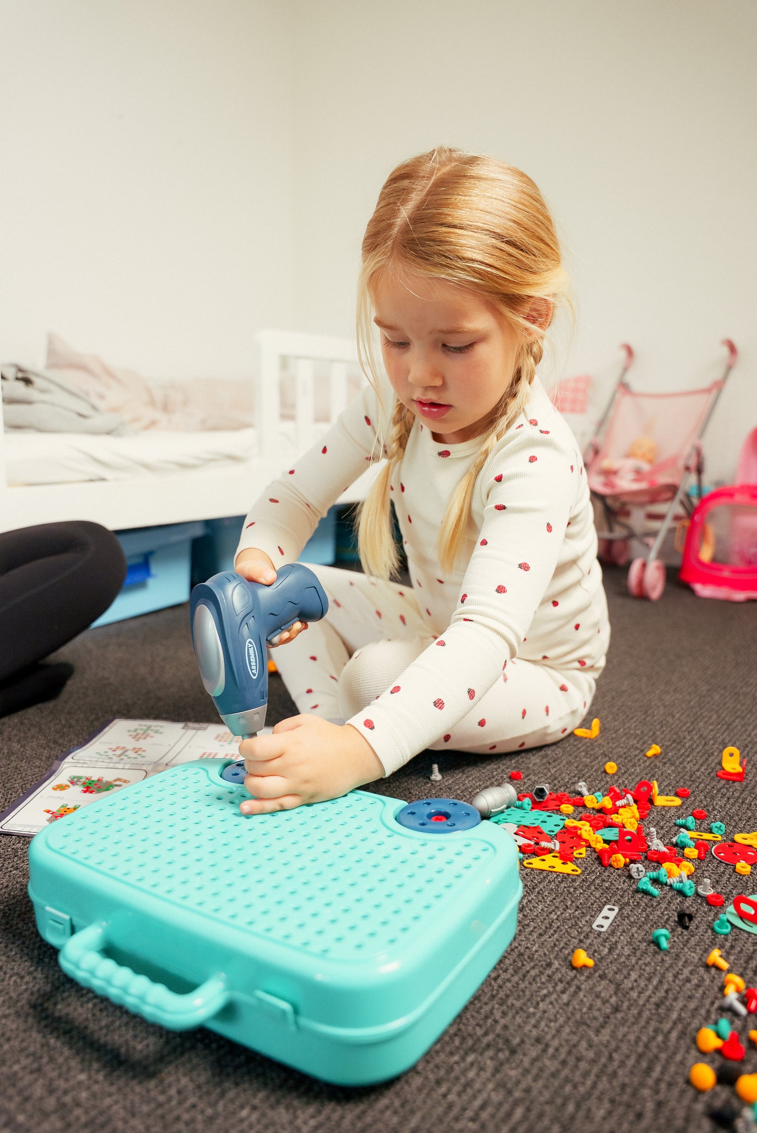 Skruekassen er et kreativt byggesæt til børn med elektrisk “skruemaskine”, skruer og plader – skabt til leg, læring og masser af konstruktion.